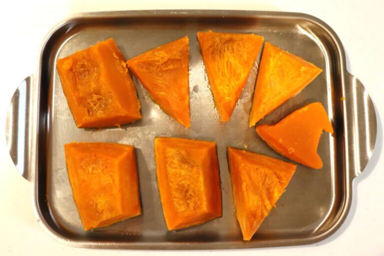 ②Peel the pumpkin and cut it into bite-sized pieces. Steam for around 10 minutes until tender, or place in a microwave-safe dish, cover loosely with plastic wrap, and heat in a 600W microwave for around 5 minutes.