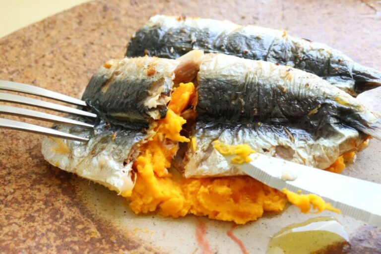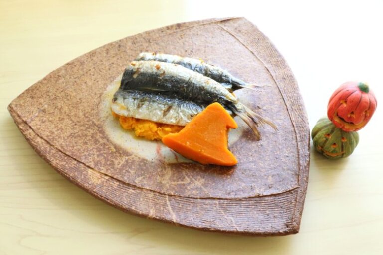 ⑤Spread the pumpkin cream(③) on a plate, place the grilled sardines(④) on top, drizzle with olive oil, and serve.